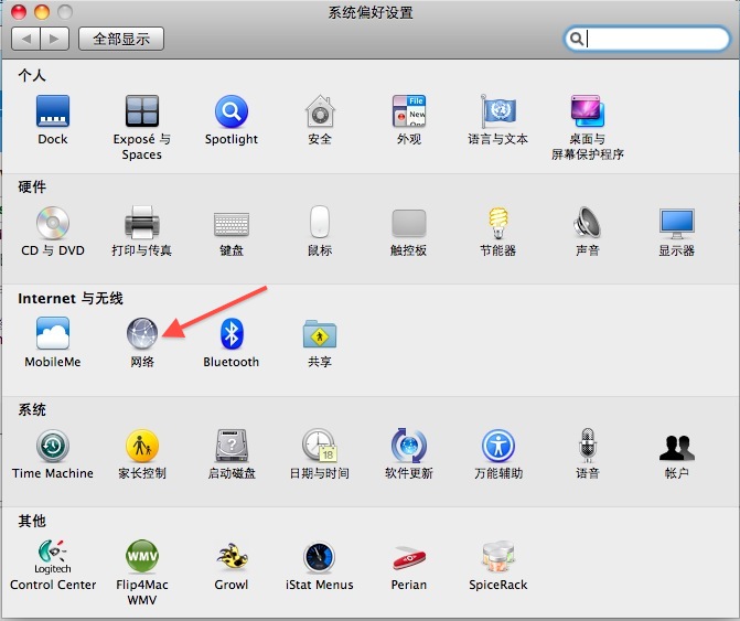 点击苹果电脑屏幕左上角的Apple标志,在下拉菜单里选择“系统偏好设置…”,再点击“网络”图标